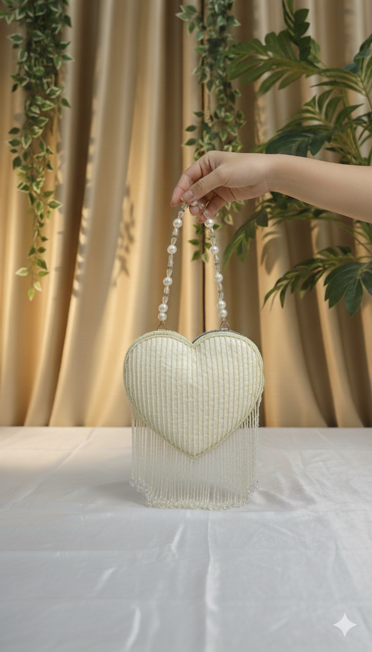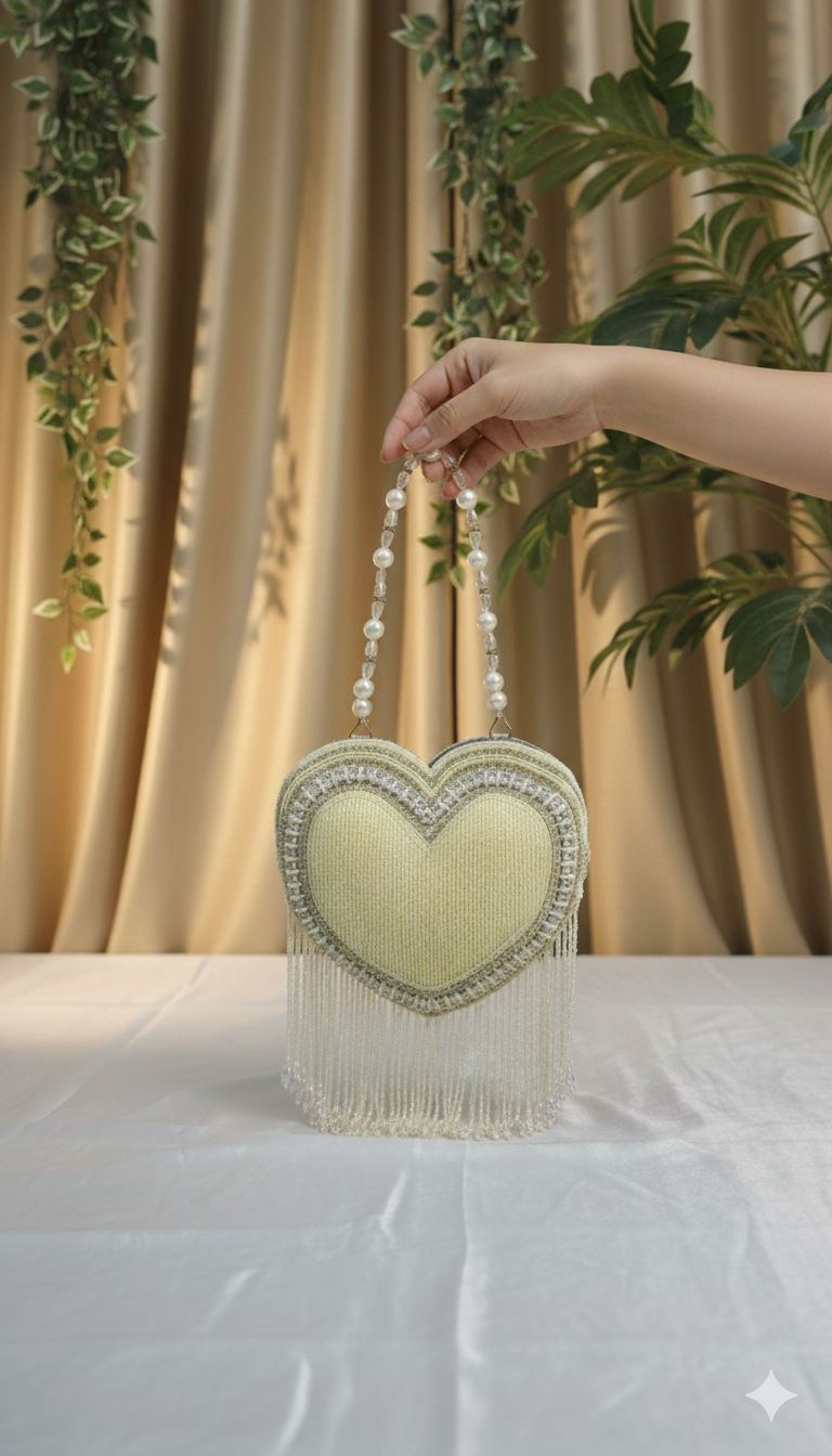 A timeless blend of elegance and charm, this golden heart-shaped potli bag is crafted to perfection. Designed with a royal touch, it’s the perfect accessory to complement festive outfits, weddings, and special occasions.
