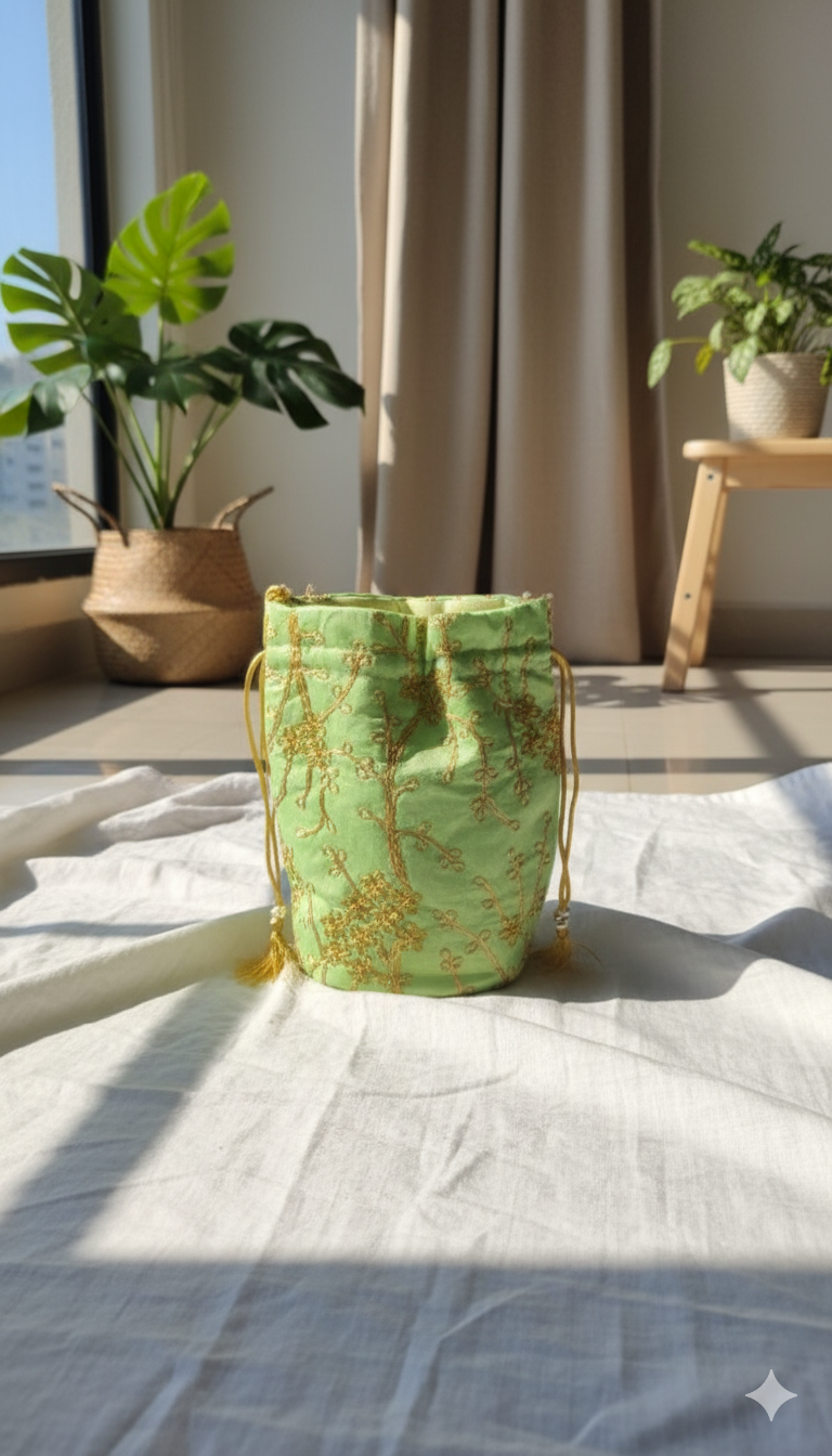 This elegant potli bag is a sophisticated accessory for any special event. It features a soft, light green fabric base adorned with delicate golden embroidery that resembles whimsical vines or branches. The intricate gold threadwork is complemented by subtle bead-like details scattered across the surface, adding a touch of shimmer and texture. The bag’s design allows it to be cinched at the top with a drawstring closure. This bag is a perfect blend of classic charm and modern style, making it a versatile addition to your festive or formal wardrobe.
