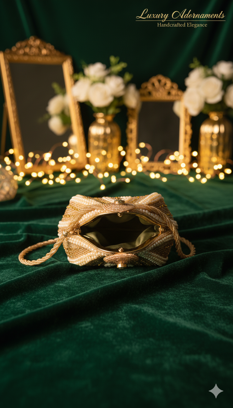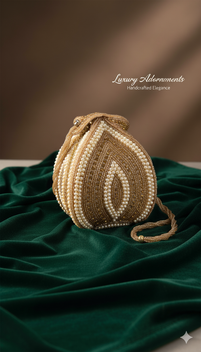 An opulent, handcrafted potli bag featuring intricate gold bead and pearl work in a unique tear-drop shape. This elegant accessory is perfect for special events, blending traditional artistry with modern style.