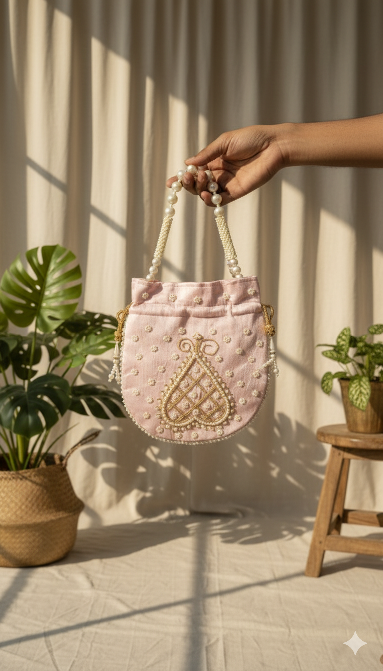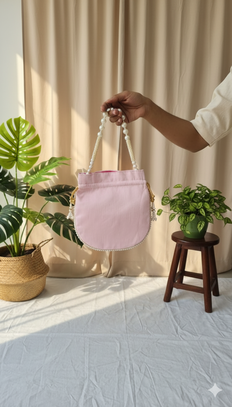 This elegant pink potli bag is a perfect accessory for adding a touch of romance and sophistication to your look. The bag is crafted from a soft, blush-pink fabric and adorned with a beautiful, teardrop-shaped central motif intricately embroidered with gold thread and white pearls. Surrounding this design are delicate pearl beads, scattered like small blossoms across the surface of the bag. The secure drawstring closure is finished with charming beaded tassels on either side. A stylish pearl handle adds an extra layer of elegance, making this bag a versatile and delightful choice for any festive occasion, from a wedding to a special evening out.